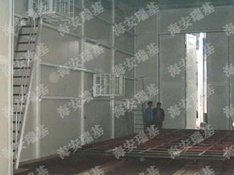 干式噴漆房的室體以鋼結(jié)構(gòu)支架壁板和玻璃墻板于一體,室體前端設(shè)有工件進(jìn)出通道,側(cè)面設(shè)有大型采光玻璃窗,室內(nèi)寬敞明亮。室體的上部設(shè)有被動(dòng)進(jìn)風(fēng)過(guò)濾層,使空氣按層流狀態(tài)均勻的進(jìn)入噴漆室內(nèi)。室體頂部的終效過(guò)濾層由一塊塊過(guò)濾板組合而成,在噴漆室頂部可以很方便地拆裝和清理。