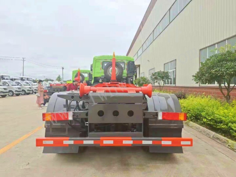 采用強度合金鋼一體式主勾臂,加強型副梁,鑄鋼尾托輪,手電一體液壓室內外操作,大臂雙杠舉升,加裝雙向平衡閥,液壓完成上箱+下箱+鎖緊+自卸等作業,實現一車配多箱的循環轉運。