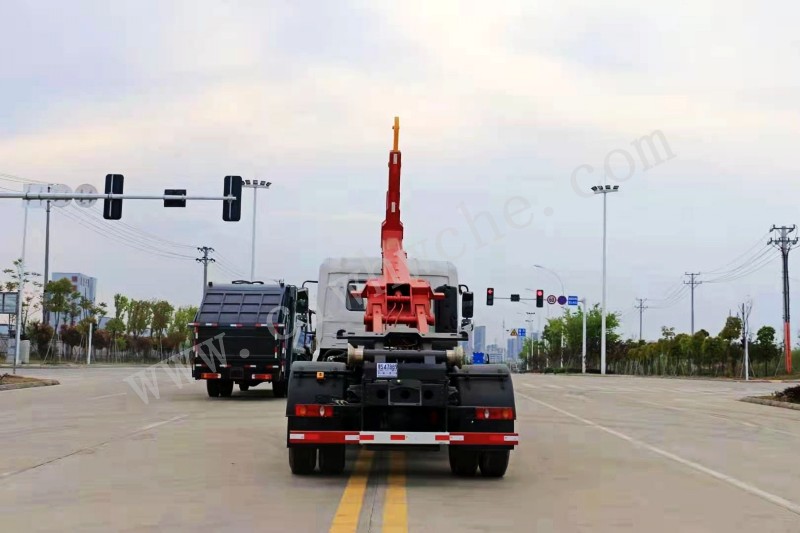 采用強度合金鋼一體式主勾臂,加強型副梁,鑄鋼尾托輪,手電一體液壓室內外操作,大臂雙杠舉升,加裝雙向平衡閥,液壓完成上箱+下箱+鎖緊+自卸等作業(yè),實現一車配多箱的循環(huán)轉運。