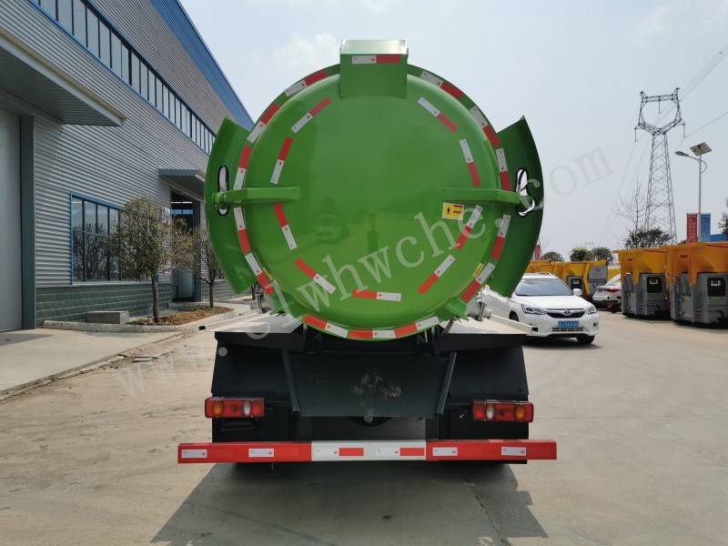 罐體采用4-5mm優質碳鋼制作,圓形罐體,罐體前后封頭采用圓弧蝶形封頭,配拉桿式提升機,可掛120/240升垃圾桶,罐體底部配雙缸液壓舉升自卸,罐體尾門液壓打開和鎖緊+手動鎖緊裝置,罐尾設液體自流閥,液位窗,后門液壓開啟,帶工具箱。