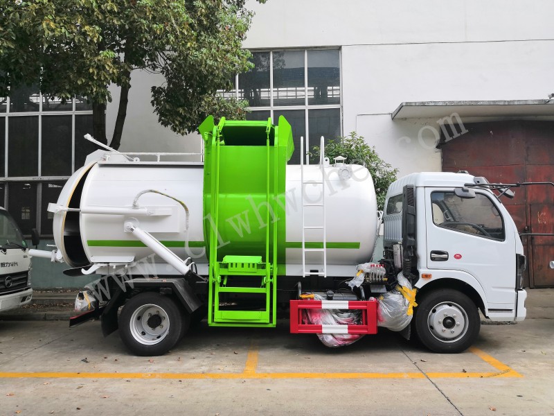 罐體采用4-5mm優質碳鋼制作,圓形罐體,罐體前后封頭采用圓弧蝶形封頭,配拉桿式提升機,可掛120/240升垃圾桶,罐體底部配雙缸液壓舉升自卸,罐體尾門液壓打開和鎖緊+手動鎖緊裝置,罐尾設液體自流閥,液位窗,后門液壓開啟,帶工具箱。