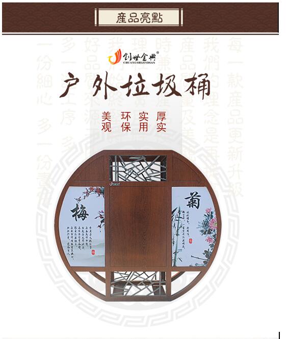 ③:整體表面處理采用熱轉印烤木紋工藝,并印有“梅蘭竹菊”四君子戶外專用圖案,色彩鮮明,壽命長,無毒無味,附著力強等特點。