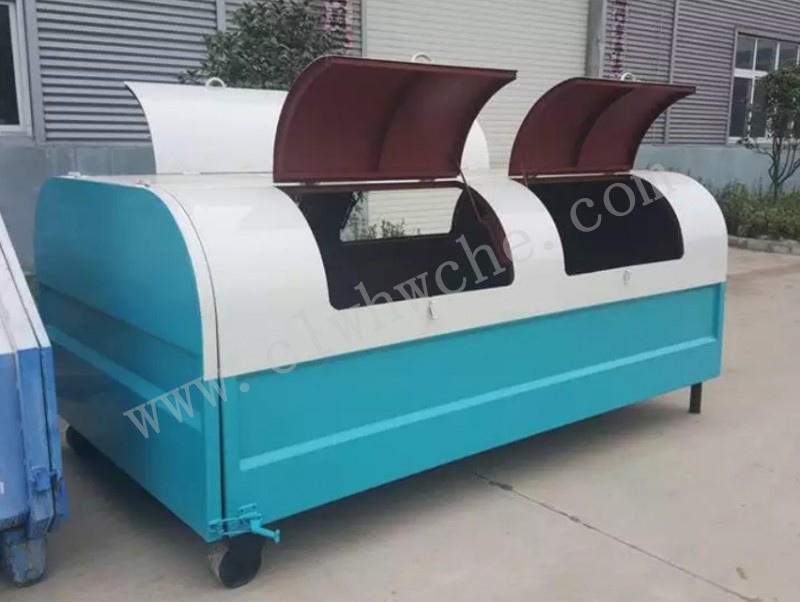 2、箱體兩側各設置1個投料口,還分別設置投料蓋,投料口的設置能**大限度滿足箱體容積使用率,減輕環衛工人工作強度;
