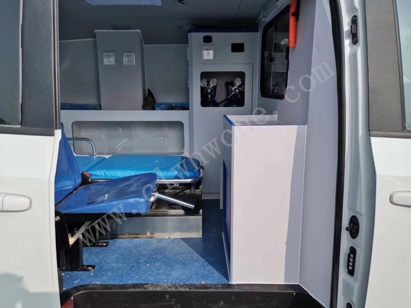前頂裝全藍**燈**報器(100W)1套;折疊式擔架1件;醫藥柜1件;固定安裝10L氧氣瓶1只;輸液吊鉤2只;消毒燈1只;污物桶1只;后艙空調和暖風;中隔斷帶滑窗1套;12V照明燈2個;500W逆變器1只;220V電源插座1組;醫用耐磨塑膠地板;貼救護十字標志;左邊長條椅軟座墊、軟靠背和安全帶1套(或單人座椅2只)