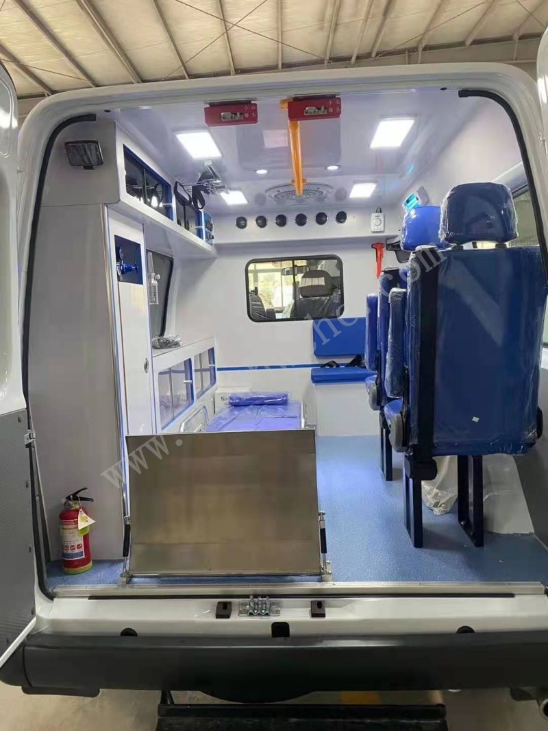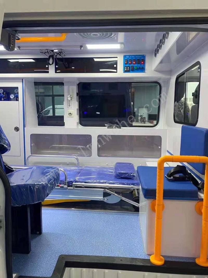 長排救護**燈1套,自動上車擔架1件,折疊擔架1件,供氧系統,氧氣瓶及氧氣瓶柜,快速接口,左側整體醫療柜;工作座椅,陪護座椅,消毒燈1只,液吊鉤2只,100W逆變器1只,外接電源系統,12V照明燈,220V電源插座2個,電源**面板1套,中隔板(帶觀察窗),可沖洗醫用耐磨地板,污物桶1只,車身廣告及救護標,后艙空調和暖風,換氣扇1部,鏟式擔架1件,滅火器1只。