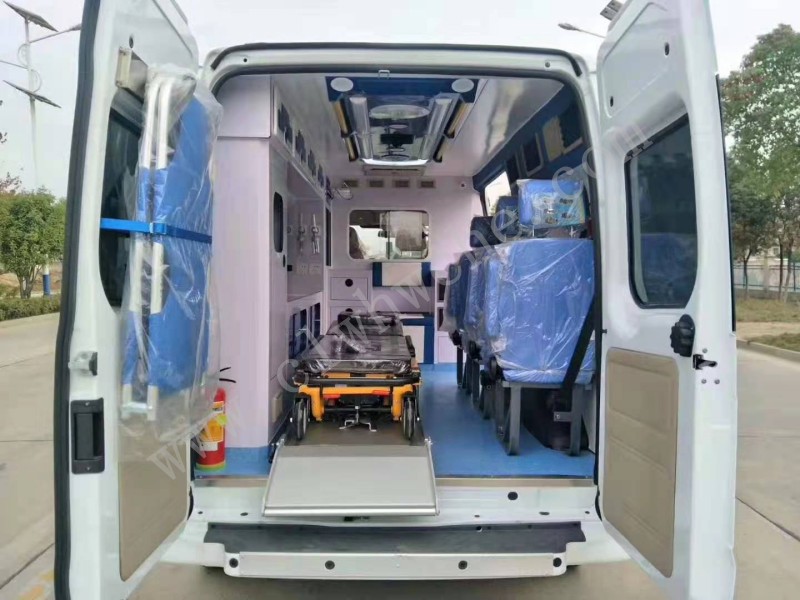 長排救護**燈1套,自動上車擔架1件,折疊擔架1件,供氧系統,氧氣瓶及氧氣瓶柜,快速接口,左側整體醫療柜;工作座椅,陪護座椅,消毒燈1只,液吊鉤2只,100W逆變器1只,外接電源系統,12V照明燈,220V電源插座2個,電源**面板1套,中隔板(帶觀察窗),可沖洗醫用耐磨地板,污物桶1只,車身廣告及救護標,后艙空調和暖風,換氣扇1部,鏟式擔架1件,滅火器1只。
