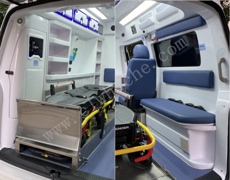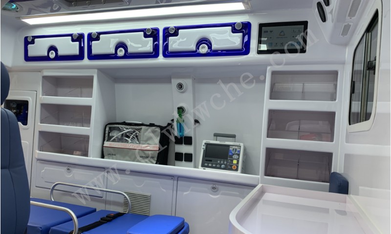 長排救護**燈1套,自動上車擔架1件,折疊擔架1件,供氧系統,氧氣瓶及氧氣瓶柜,快速接口,左側整體醫療柜;工作座椅,陪護座椅,消毒燈1只,液吊鉤2只,100W逆變器1只,外接電源系統,12V照明燈,220V電源插座2個,電源**面板1套,中隔板(帶觀察窗),可沖洗醫用耐磨地板,污物桶1只,車身廣告及救護標,后艙空調和暖風,換氣扇1部,鏟式擔架1件,滅火器1只。