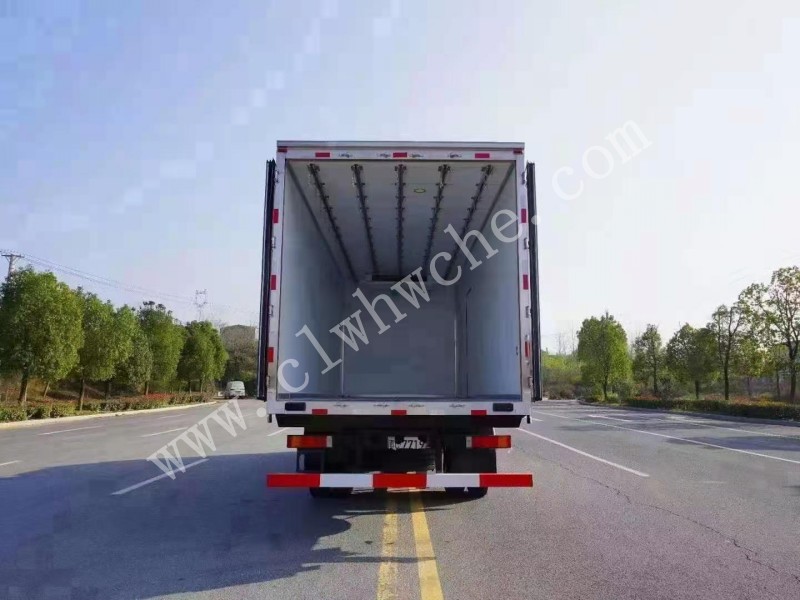 廂體全面采用優質玻璃鋼制造,樹脂膠無縫粘連,中間8CM厚聚氨酯保溫板,后門全密封雙開門,不銹鋼后門合頁及鎖件,廂體內部采用LED照明燈及廂體示寬燈,品牌專用冷機、底板為防滑花紋鋁板。