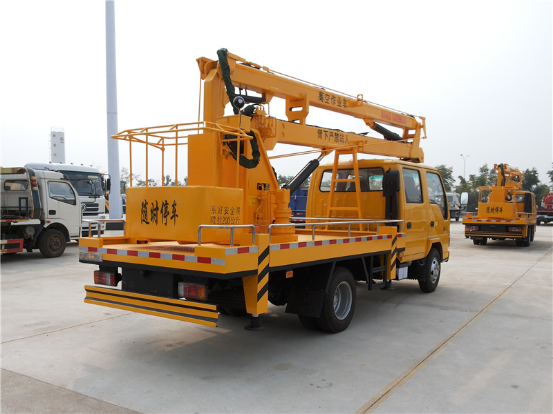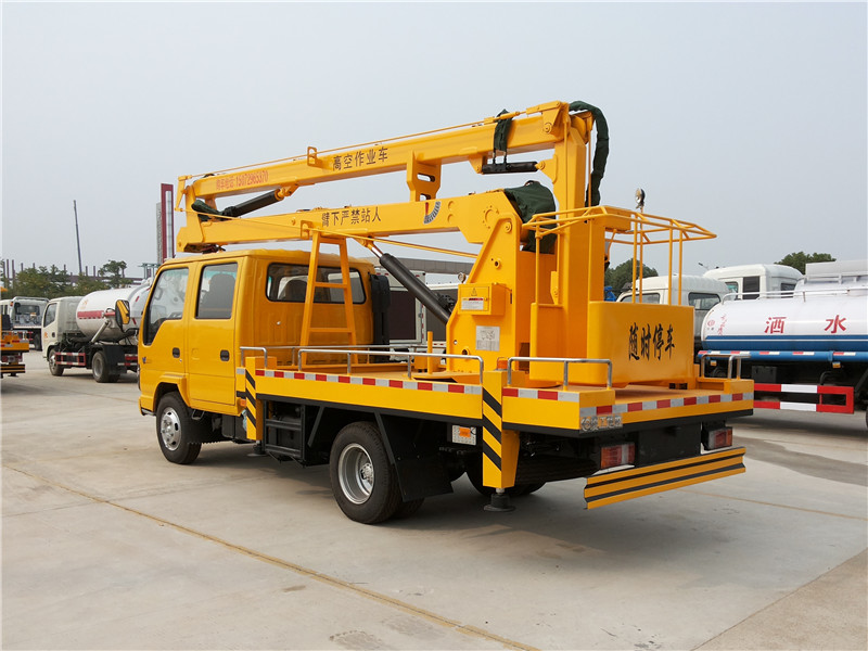 五十鈴雙排不翻轉駕駛室,轎車化內飾,軸距3360mm,五十鈴發動機國五發動機,配置五十鈴MSB五檔變速器,冷暖空調,標配方向助力,雙排前橋2噸,后橋4.8噸,7.00-16尼龍胎,帶USB接口 五十鈴高空作業車作業高度為16米,液壓360度全回轉,三節折疊臂,單液壓舉升缸,帶雙向平衡閥,電控操作舉升臂,四支液壓油缸可調式支腿帶雙向液壓鎖(支腿操作為手動操作,可單獨**),帶1噸吊鉤.